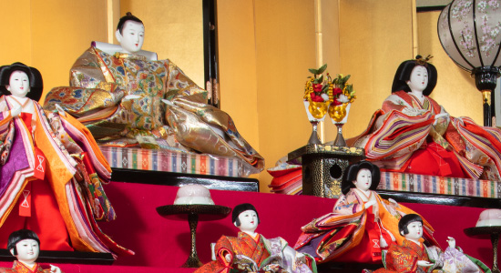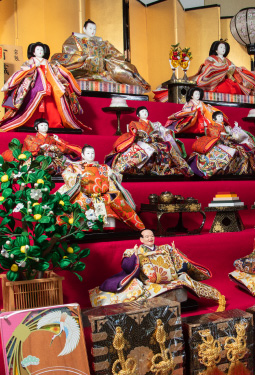 ひなまつりの主役は、雛人形です。最上段に飾られる女雛と男雛は、内裏雛(だいりびな)あるいは親王(しんのう)雛などと呼ばれます。これに三人官女(かんじょ)や五人囃子、随身(ずいしん)、仕丁(じちょう)などを加えた15人をきまり物と呼び、標準的なひと揃いとされています。