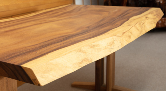 当社ショールームでは和茶、座卓など吟味した素材による銘木家具を一堂に展示即売致しております。二つと同じものが無い美しい木肌と風格があります。